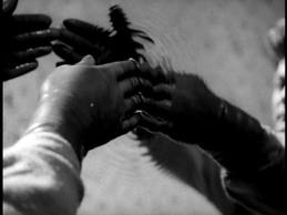 Orpheus doesn’t think he can do anything since his wife is there dead in front of them but Heurtebise tells him that’s one of her faces like the princess is one of death’s faces. “Your wife is in another world. I invite you to follow me there,” says Heurtebise. Orpheus says he’d follow her into hell but Heurtebise says there is no need to go that far. Heurtebise orders Orpheus to put on magic rubber gloves which will allow him to pass through mirrors like water. Orpheus puts on the rubber gloves and sticks his hand in the closet mirror and like a ripple of water the two of them both walk through. There is a mystical shot of Orpheus and Heurtebise going through the portal towards the underworld in slow motion passing drifters lost in time to a place that is called no mans land where it involves men’s memories and the ruins of their beliefs.