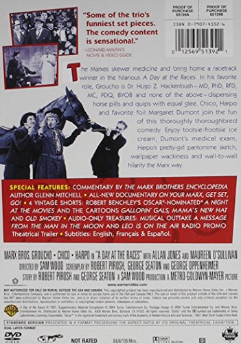 A Day at the Races is the Marx Brothers at their commercial and popular peak, working with a top Hollywood director (Sam Wood of The Pride of the Yankees), supported with a healthy screen budget paying for such extras as a blue-tinted ballet sequence, love songs from crooner Allan Jones, and decorative sets. But the brothers are also at the top of their game in terms of their own comic material and timing. The story finds Groucho, Chico, and Harpo helping out at a sanatorium, where their longtime foil in the movies, Margaret Dumont, is the leading patient. The film has some of the trio's funniest and most memorable bits and a dazzling horserace at the climax. Not quite as good as its predecessor, A Night at the Opera, this is still a highlight in the Marxian filmography. --Tom Keogh
