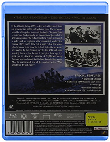 Australia released, Blu-Ray/Region A/B/C : it WILL NOT play on regular DVD player. You need Blu-Ray DVD player to view this Blu-Ray DVD: LANGUAGES: English ( Dolby Digital 2.0 ), English ( Subtitles ), SPECIAL FEATURES: Black & White, Cast/Crew Interview(s), Interactive Menu, Making Of, Scene Access, Short Film, SYNOPSIS: In the Atlantic during WWII, a ship and a German U-boat are involved in a battle and both are sunk. The survivors from the ship gather in one of the boats. They are from a variety of backgrounds: an international journalist, a rich businessman, the radio operator, a nurse, a steward, a sailor and an engineer with communist tendencies. Trouble starts when they pull a man out of the water who turns out to be from the U-boat. Later, the survivors are spotted by the German supply ship Willi had been steering them to, but before it can pick them up, it is sunk by an American warship. A frightened young German seaman boards the lifeboat, brandishing a gun. After he is disarmed, one of the survivors asks, "What should we do with him?" SCREENED/AWARDED AT: Oscar Academy Awards, ...Lifeboat ( Life boat )