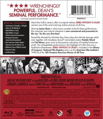As an actor who spoke for an entire generation, James Dean brought his explosive presence to the screen in Nicholas Ray's "tense, exciting melodrama" (Variety). Oscar-nominees and Golden Globe-winners Natalie Wood ("Splendor in the Grass") and Sal Mineo ("Exodus") both earned Oscar nominations for their powerful performances in this realistic journey through a turbulent teenage universe of violence and delinquency. Nominated for an Academy Award for Best Writing. The Library of Congress honored this classic by including it in the National Film Registry. Recently selected by the prestigious American Film Institute as one of the 75 greatest American films of all time.