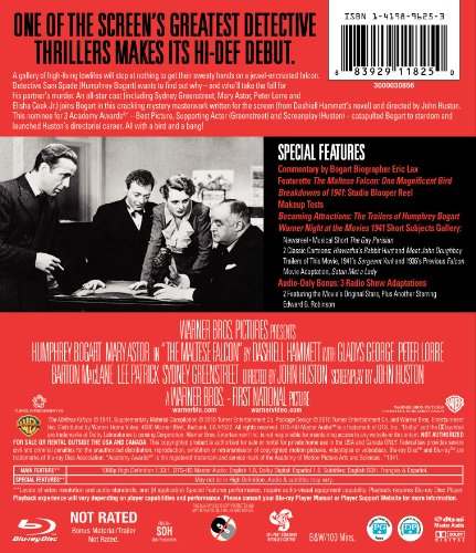 A gallery of high-living lowlifes will stop at nothing to get their sweaty hands on a jewel-encrusted falcon. Detective Sam Spade (Humphrey Bogart) wants to find out why--and who'll take the fall for his partner's murder. An all-star cast (including Sydney Greenstreet, Mary Astor, Peter Lorre and Elisha Cook Jr.) joins Bogart in this crackling mystery masterwork written for the screen (from Dashiell Hammett's novel) and directed by John Huston. This nominee for 3 Academy Awards00Best Picture, Supporting Actor (Greenstreet) and Screenplay (Huston)--catapulted Bogart to stardom and launched Huston’s directorial career. All with a bird and a bang!