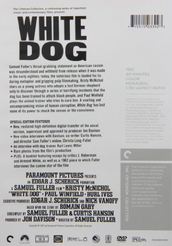 Samuel Fuller's throat-grabbing exposé on American racism was misunderstood and withheld from release when it was made in the early eighties; today, the notorious film is lauded for its daring metaphor and gripping pulp filmmaking. Kristy McNichol stars as a young actress who adopts a lost German Shepherd, only to discover through a series of horrifying incidents that the dog has been trained to attack black people, and Paul Winfield plays the animal trainer who tries to cure him. A snarling, uncompromising vision, White Dog is a tragic portrait of the evil done by that most corruptible of animals: the human being.