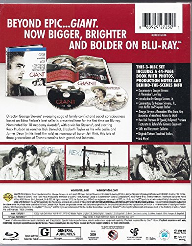 "THIS 3-DISC SET INCLUDES A 44-PAGE BOOK WITH PHOTOS, PRODUCTION NOTES AND BEHIND-THE-SCENES INFO • Documentary by George Stevens: A Filmmaker's Journey • Introduction by George Stevens, Jr. • Commentary by George Stevens, Jr., Ivan Moffat and Stephen Farber • George Stevens: Filmmakers Who Knew Him, Memories of Giant and Return to Giant • New York Premiere TV Special, Hollywood Premiere Featurette & Behind the Cameras Segments • Stills and Documents Galleries • Original/Reissue Theatrical Trailers • And More!"