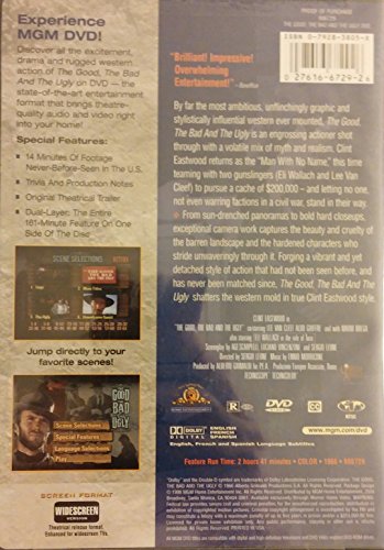 Clint Eastwood (the Man with No Name) is good, Lee Van Cleef (Angel Eyes Sentenza) is bad, and Eli Wallach (Tuco Benedito Pacifico Juan Maria Ramirez) is ugly in the final chapter of Sergio Leone's trilogy of spaghetti westerns (the first two were A Fistful of Dollars and For a Few Dollars More). In this sweeping film, the characters form treacherous alliances in a ruthless quest for Confederate gold. Leone is sometimes underrated as a director, but the excellent resolution on this digital video disc should enhance appreciation of his considerable photographic talent and gorgeous widescreen compositions. Ennio Morricone's jokey score is justifiably famous.